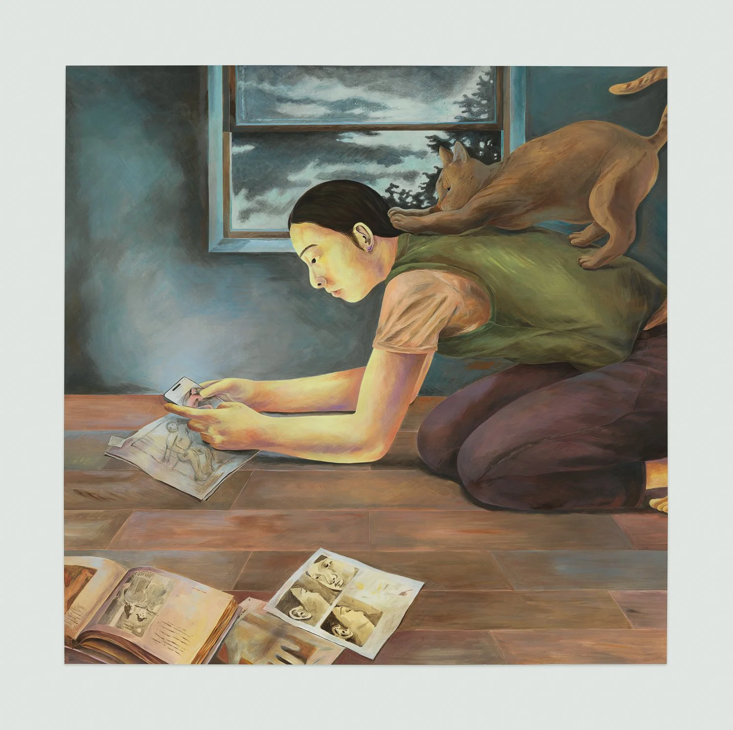In Soliloquy, the artist again arranges references, both with physical print-outs and drawings, as well as attends to the glow of her iPhone. She is crouched over in an impossible form (notice the spacial fuckery of her body in relation to the floor boards), with her cat, Louis, perched on her back. He seems to guide her, or at least anchor and ground her. Cats and dogs exist in an ambivalent space: humans change them and they change us, but neither is fully domesticated to the other. There is always a push and pull, a conflict.