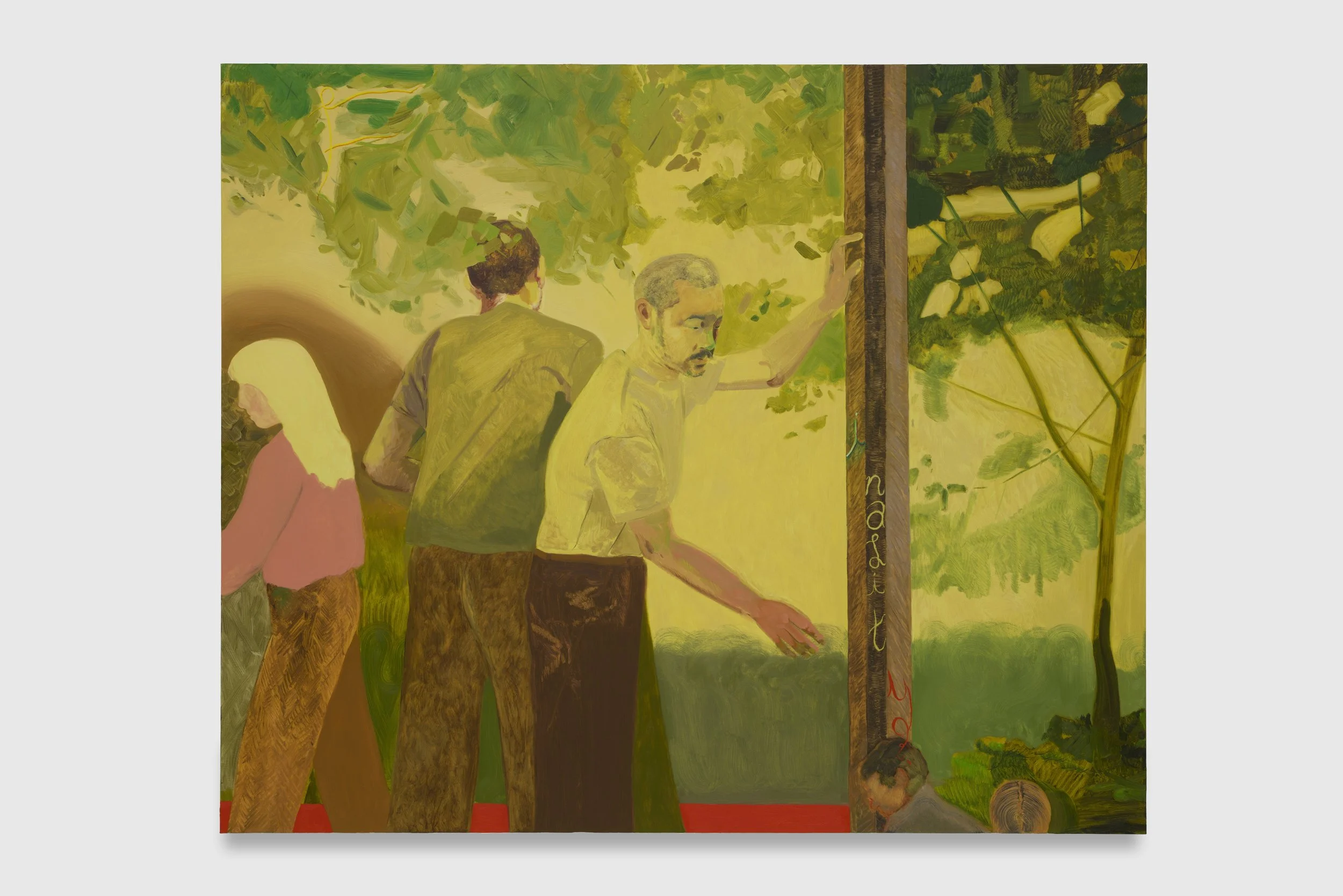Time, as a symptom takes its title from a Joanna Newsom song, the last track on her 2015 album Divers. That particular album is a closed circuit, the last sound/syllable leads into the first, forever in a loop. Time is a dominant theme in Wong’s work, both in the ways that it could exist beyond our understanding, spatially and dimensionally, as well as in the weight that joy and terror place on our experience of it. In Time goes both ways (taking its title from a lyric within the show’s titular song) this is most evident, with figures repeating and stuttering across a landscape. While ominous, it reads like a less horrific counter to the visual play found in Sandro Botticelli’s The Story of Nastagio degli Onesti. The stark vertical trees seem a direct reference to that suite of images.