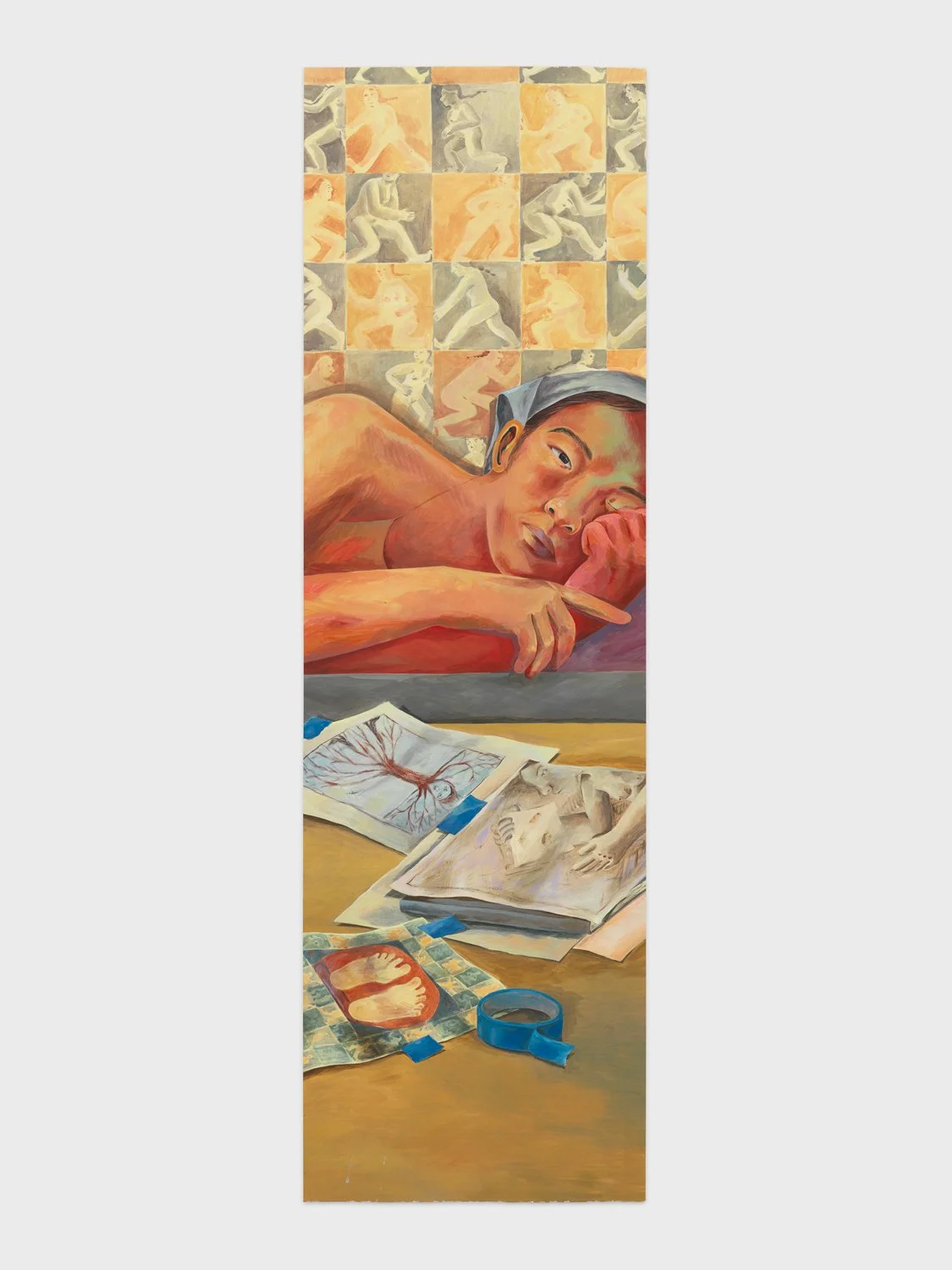 The Source is one of two paintings that not only points to outside artworks but considers that very action of pointing. Before the portrayed reclining artist, waiting to be taped to the wall with the recognizable blue artist tape, are prints of a Louise Bourgeois etching, one of Wong’s own works, and an artwork that was in the MET’s recent exhibition, Mandalas: Mapping the Buddhist Art of Tibet. This last reference is the most interesting as it inspired Wong to make the painting within the painting, visible on the wall behind the artist. There she renders her own versions of the gridded deities.