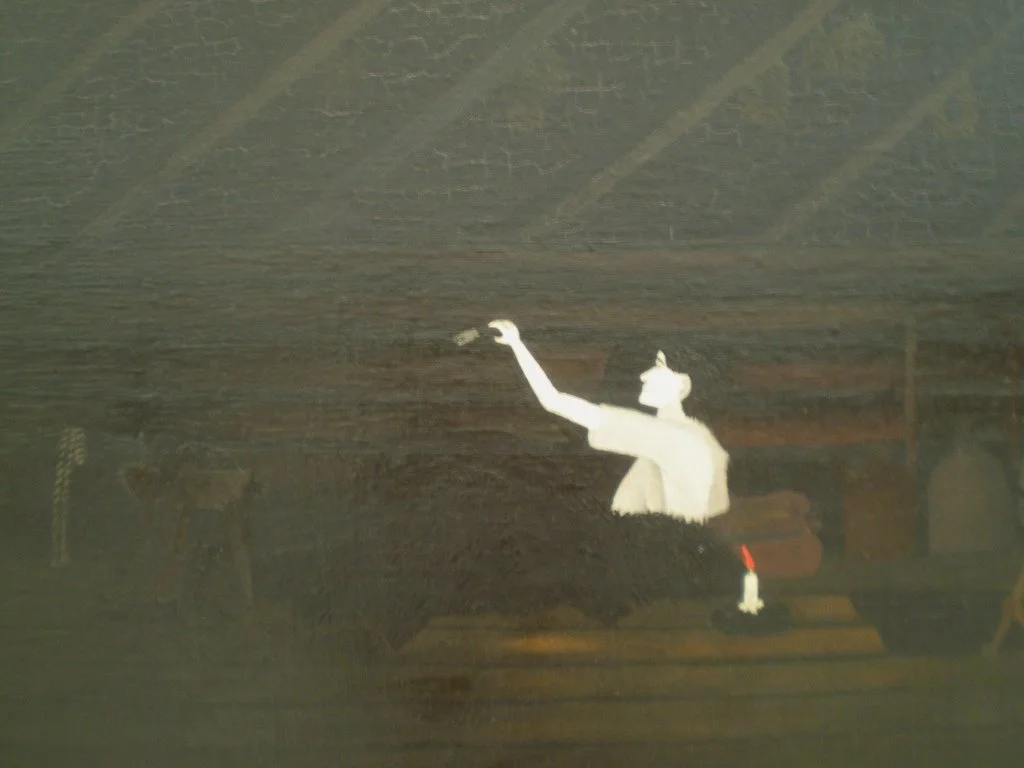 Pippin set Abraham Lincoln and his Father Building Their Cabin on their newly acquired land, under a crisp fall sky with oak leaves floating to the ground in early autumn. Son standing in front of father, each faced in opposite directions, arms like levers, axes in motion, and fallen trees around them. In the background, the cross-cut logs of the half-built cabin faced the viewer, while angled stumps of the once forested land stretched to the edge of the forest. Pippin’s painting, Abraham Lincoln, the Great Emancipator Pardons the Sentry, took place under a canopied tent at dusk, a lantern hanging at its apex. The deep blue sky entered through its entrance. To its left stood two Union soldiers. To its right, their shadows cast against the tent wall, stood a general and Lincoln, his hands upon the shoulders of the kneeling guard. Anecdote tells us the guard had fallen asleep at his post. In all three works, Pippin imagined intimate moments that often go unrecognized. He made them important, treating them with a high degree of formal invention, with an ethic that recognized such positive actions as enactments, which, along with the important things of ‘history,’ changed our future.